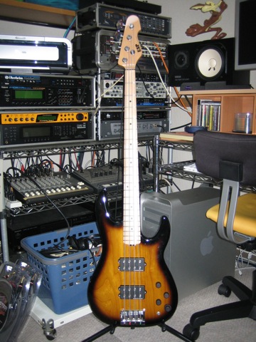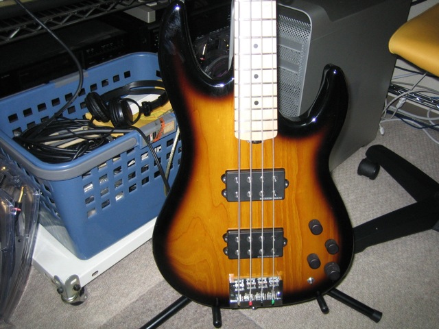 発注内容は。 1.アッシュボディ出来ればホワイトアッシュに 2.メイプル指板 3.ダブルハンバッカーPU(ダンカン社製) 4.市販されてるAPシリーズをベースに 5.Volなど操作系をピック弾き時邪魔にならないよう下目に取り付け 市販のAPシリーズって結構高いのでダメ元でお願いして みましたが、快諾していただき待つこと1ヶ月少々。 届いたのが↓ ネックはスーパーロングスケールでちょっと長め。 低音の確保とダウンチューニング対策らしい。 色は指定していなかったのですが、アッシュ材の木目を生かした ブラックサンバーストにしてくれたようです。 ボディのアッシュ材はホワイトアッシュなので超重いっ。。。 試しに家で弾いてみたら結構パキパキ系でメリハリの利いた感じ。 いつもワガママを聞いてくれるESPさんに感謝です。 宣伝がてらベースモデルのAP bassはこちら←クリック。
