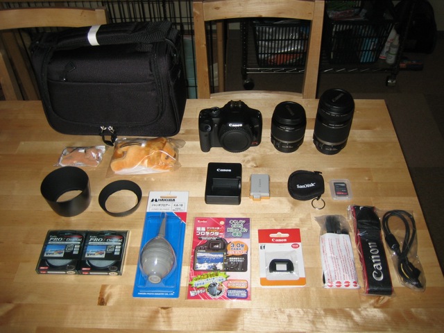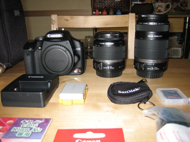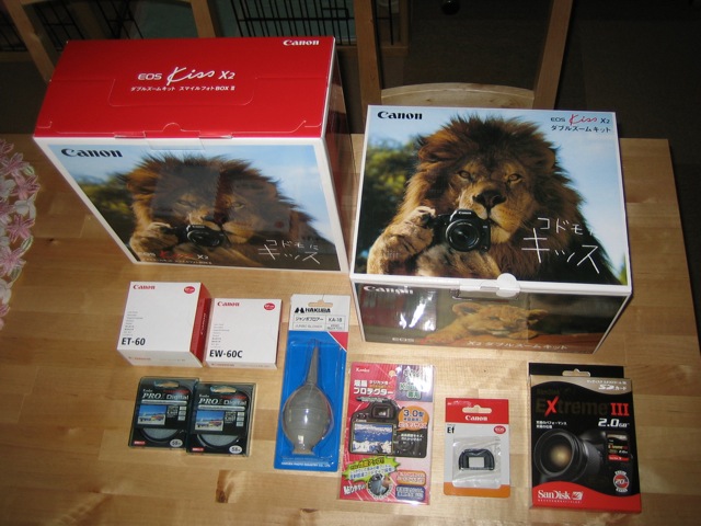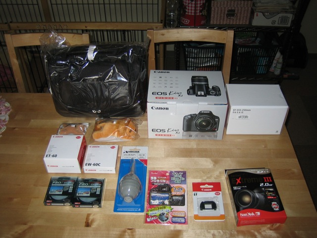 とうとう購入いたしました。Wズームセットです。 いろいろネットで調べたり実機をお店で触ったりして、 同じCanonのEOS 40Dと悩んだ結果EOS Kiss X2に決めました。 (決めては軽さ。40Dは意外と重かった。。。) 決めたら欲しくなるのが人情。。。 で、近所の量販店を4〜5件まわり価格調査。 EOS Kiss X2は売れているので強気なのか、各店舗横並びで 12万円前後。SDカードやフィルターなどの小物を一緒に買うと 一番安かったヤマダ電機でも13万円オーバー。 しかも、2週間待ち&キャンペーンで付いてるはずのバックも無し! そこで価格ドットコムにてお安いネットショップを調べ、 本体と小物類を買い物かごに入れて送料込みの価格を計算。 ・・・すると、全部で約12万円。しかもバック付き。 3秒後にはポチッと押してました。。。 しかも翌日(今日の夕方)に届きビックリ! 最近のネットショップはスゴイ(速い)ですね〜。 初心者なんで、フィルターの取り付けから分かりませんでしたが なんとか組み終わり、説明書とにらめっこ。 早速試し撮りしようかな?っと思ったのですが、 外はすでに日が暮れて雨まで降ってきた。。。 只今家の中でワンコを相手に試行錯誤しております。 今まで(約4年間)使ってたコンパクトデジカメ